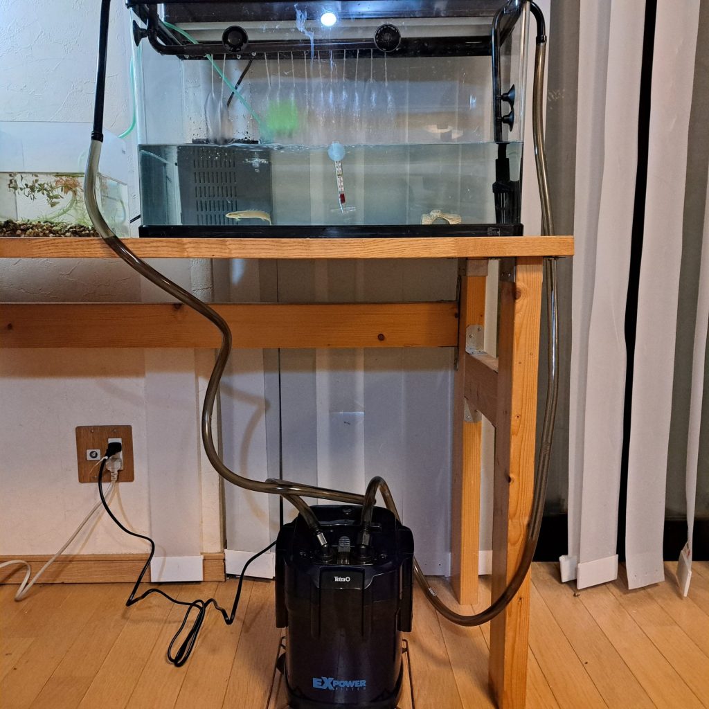 とりあえず今使っていて濾過バクテリアがすでに繁殖しているフィルターを使って水を安定させますが重量の問題で低水位で飼うことになってしまった。